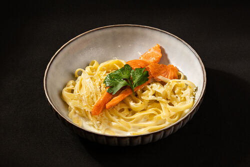 Спагетти в сливочном соусе с кусочками форели и пармезаном