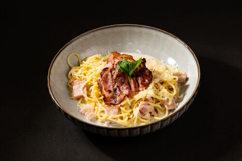 Спагетти с беконом в сливочном соусе, сверху тёртый пармезан