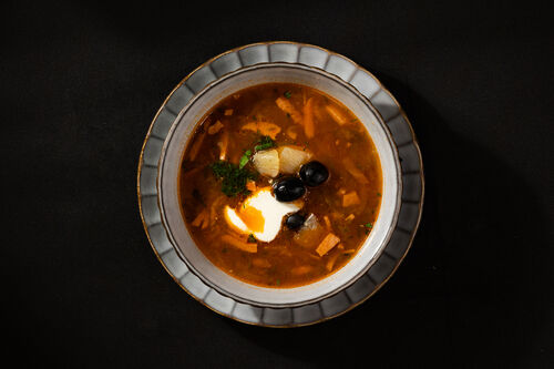 Солянка — это сытное и ароматное блюдо на основе мясного бульона, приготовленное с разнообразными мясными ингредиентами, копчеными продуктами и овощами.