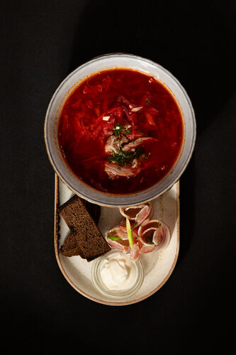 Наваристый борщ с говядиной и грудинкой, подаётся со сметаной и зеленью