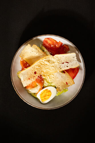 Салат "Цезарь" с форелью представляет собой изысканное сочетание свежих хрустящих листьев салата, нежной форели и классического соуса "Цезарь", обогащенного пармезаном и хрустящими гренками.